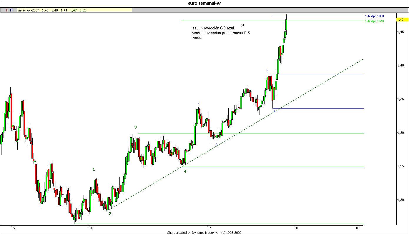 Pues Gofio, voy a redundar tu opi pa que te animes y no te sientas solo. El recuento del diario ta claro. Añadiría que el 1.47 es también la proyección de la 3 desde el final de la 4 de este impulso...¡tomaresistencia! amás estoy de acuerdo contigo en que puede ser la 5 de la 5 de la ..y ya me voy perdiendo contando cincos. Pa empezar el mensual: ahí ta tan claro como en el diario que estamos en la 5. Pa continuar el semanal, donde ya no ta tan claro