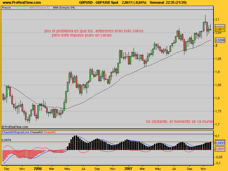 Pos el gráfico mensual delata un potencial bajista tremendo. Lo malo es que el semanal no dice claramente si el impulso este se ha acabao. No, si cuanto más gordo es el movimiento próximo, menos fácil lo ponen, leñe.