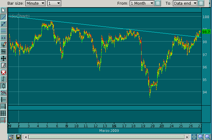 El USD/JPY ha recuperado el tortazo que se pegó el 18 y 19 de Marzo como consecuencia de los anuncios de compra de deuda Yankee. Parece interesante ver cómo el tortazo del USD frente al EUR, se mantiene, pero frente al JPY ya se ha recuperado.