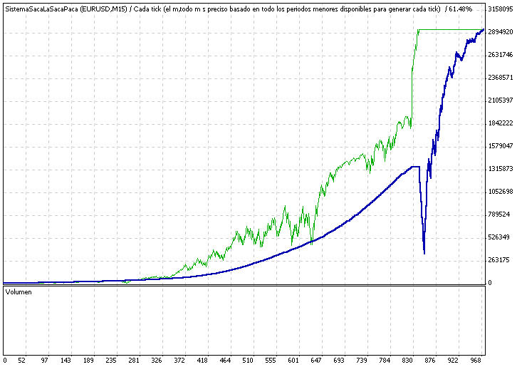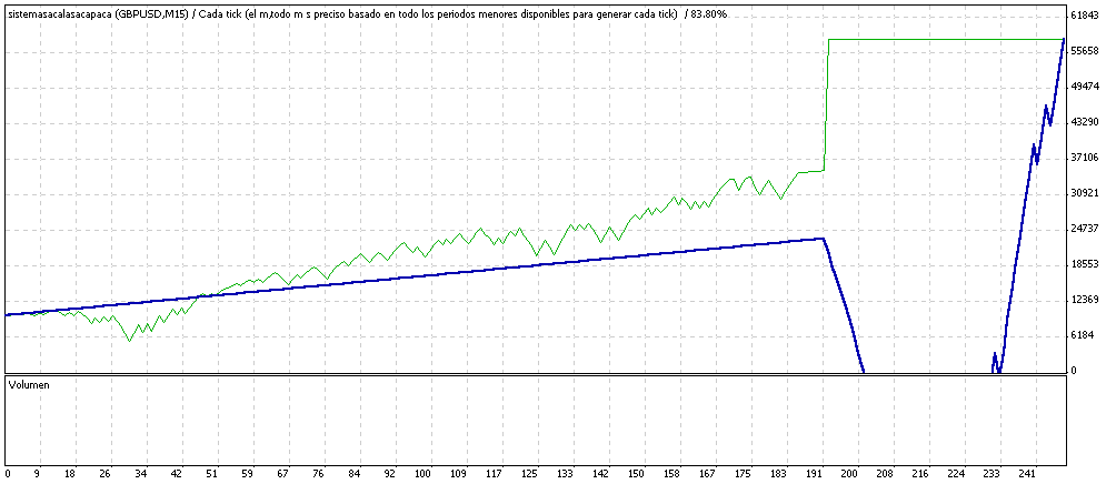 La equity es la roja y está siempre sobre 0. Lo de la azul (balance de cerradas) sucede por el funcionamiento del tester, por lo visto al final del recorrido (linea roja ya plana) cerró primero todas las de perdidas y despues las de beneficios y trazó esos curiosos dibujos.