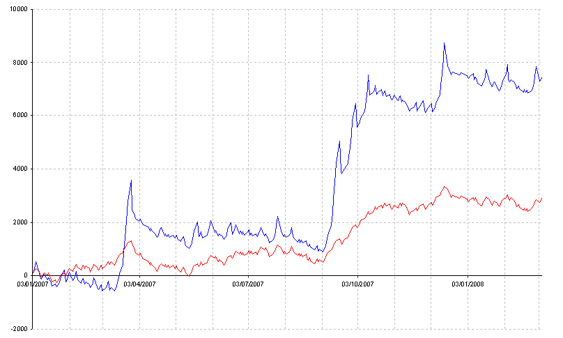 El sistema es el mismo, únicamente cambia el manejo de contratos. La línea roja representa la evolución de la curva de resultados negociando 1 contrato, la azul (repito, aplicada al mismo sistema) evoluciona incrementando contratos a medida que gana. Si eres buen observador, abres un poco la mente (más que nada para evitar prejuicios) y tienes algo de experiencia interpretando gráficos, no creo que necesites más para entender por qué es tan importante un buen MM incremental.