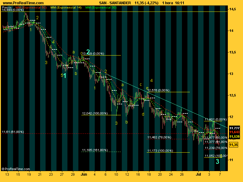 Pues como el amigo Jack he desmenuzao en sus partes correspondientes el gráfico intradiario del santander y veo, veo...pues que está acabando la tercera onda y que la 5 se va a extender, con lo que el tramo desde mayo a aquí, pos se volverá a repetir. Ahora reculará en la onda 4 que ha de durar unos días. La 2 apenas retrocedió a la 1 con lo que entrar largo es una operación no muy lucrativa pal riesgo que implica, que a la que te descuidas te hace una corrección continua y hale. Aunque dado que la 2 era una plana y que consumirá más tiempo que precio, pues apuesto por un triángulo. A ver si hay suerte que como haga un triángulo pillo el recorrido desde el principio :-D Amos a zurrarle, como diría Frankcis jejeje.