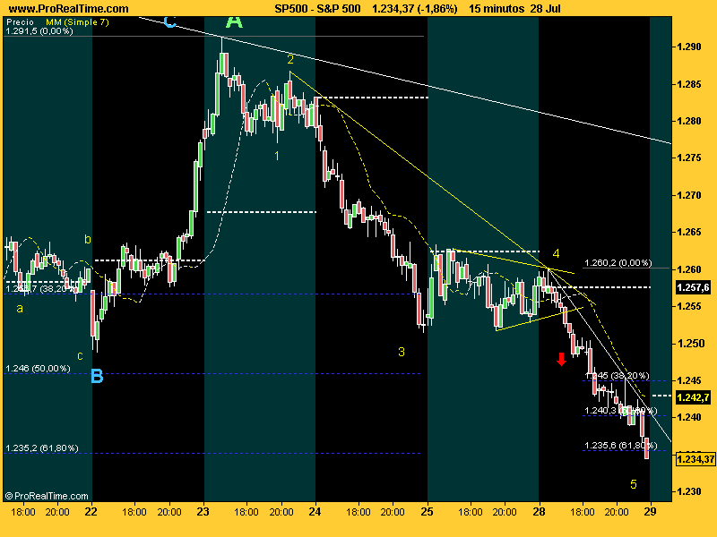 Pues no me cuadraba que fuera un suelo tan suelo esto como dice más de uno por ahí. A mí me da que estamos haciendo una onda cuarta. Dado que suelen ser largas y la subida ha sido corta en el tiempo, creo que el rebote es la onda A de la corrección (estoy hablando del sp, pero me parece que los uropeos estarán en situación parecida aunque ahora mismo paso de ellos :-D ). Como veo una plana como onda 2 pos la opción más sencilla que me queda es un triángulo. Hemos hecho un zigzag y parece que la onda A del segundo, con lo que esto toma forma de triángulo por el momento. Esperamos un rebotillo y de nuevo cerca de los mínimos, sin olvidar que nunca coincidirá con el mínimo anterior: los mamones de los triángulos siempre giran de repente y donde menos se espera nadie :-D Otra pista de que fuera un triángulo la tendríamos si la onda c fuera más larga que las anteriores. El caso es que probablemente creo que el maximillo ese que ha hecho, se va a quedar ahí tomando la fresca un rato y antes se va a perforar el mínimo :shock: