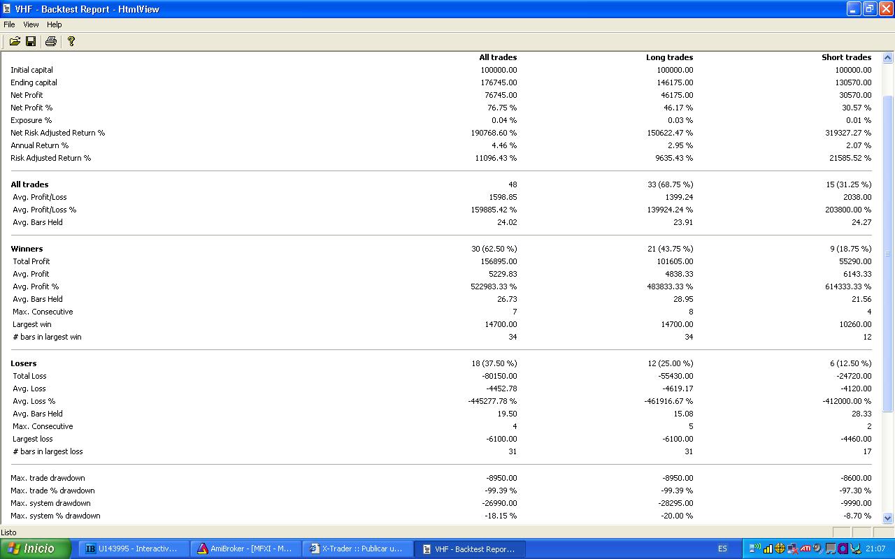 No tengo el ami y me costaría unas cuantas horas o días entre que instalo y demás. Si alguien que maneje esta plataforma es tan amable de cargar el sistema en el ibex y decir si las estadísticas coinciden, se lo agradezco.
