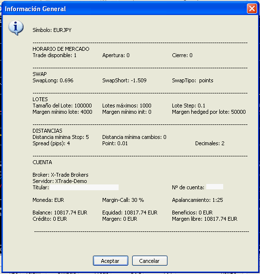 Comenzaré con un include sencillito que tengo para mis programas. Yo lo suelo ejecutar al inicio de los Expert para saber la información de la cuenta y del par antes de que empiece. Es una función y devuelve el entero devuelto a su vez por el MessageBox. Ese entero me permite controlar si quiero continuar con el expert o cancelar tras ver la info.