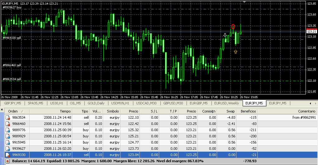 Círculo rojo: Momento en el que se perdían 30 pipos. Con otras estrategias en esa zona roja ya me debería haber saltado el stop. Esa es la diferencia principal de la cobertura.