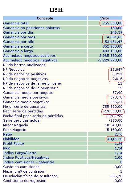 Una buena regla que te puede ayudar a saber si estas frente a un sistema que tenga una buena media por operación es exigir que esa media sea al menos dos veces el gasto creado por comisiones y deslizamientos. Para el futuro del Ibex al menos deberías de tener una media sin descontar gastos de 130 € o 140 €.
