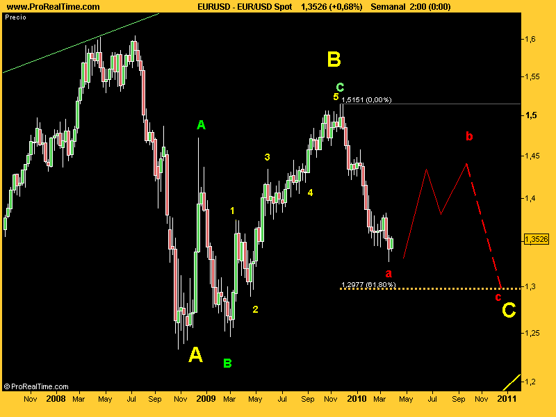 Pues puede ser que la primera onda bajista (a roja) de la gran C amarilla haya acabado y ahora venga un periodo confuso arriba pero sin fuerza...creo que esto es un triángulo contracto que empezó en julio de 2008. Ahora estaríamos en el centro y eso quiere decir que hay mucha indecisión. De todas formas, habría nuevos mínimos más adelante para completar esta C. He puesto unos garabatos maomeno a bulto porque en el centro del patrón es donde menos claro se ve nada...Hay que tener en cuenta que si es un contracto esto irá perdiendo gas poco a poco...con lo que este descenso C todavía es corto en tiempo y precio para darlo por concluido y que empiece una D mayor alcista...