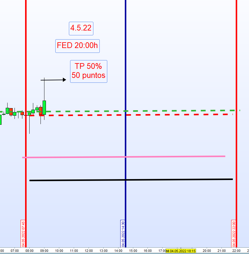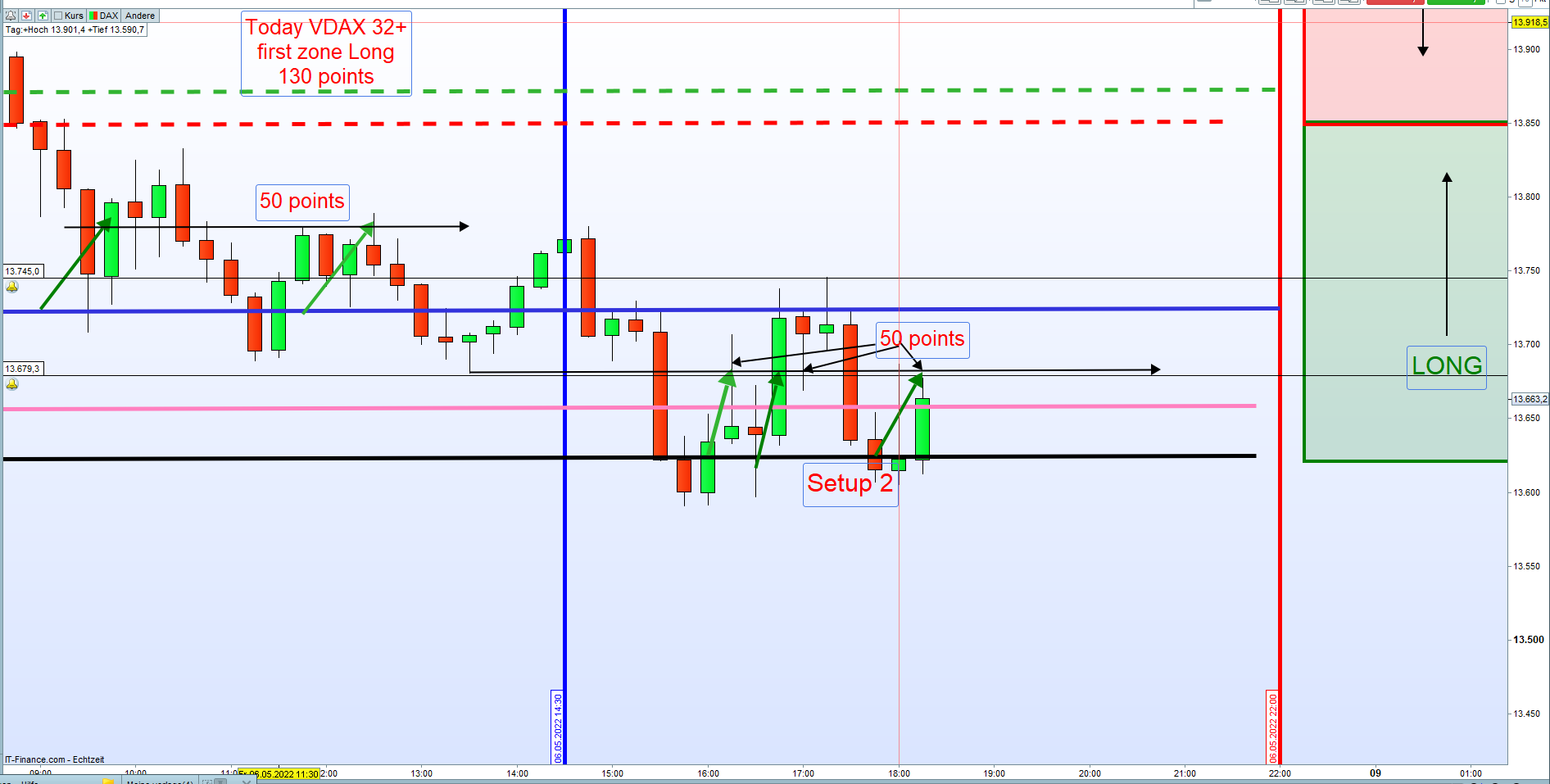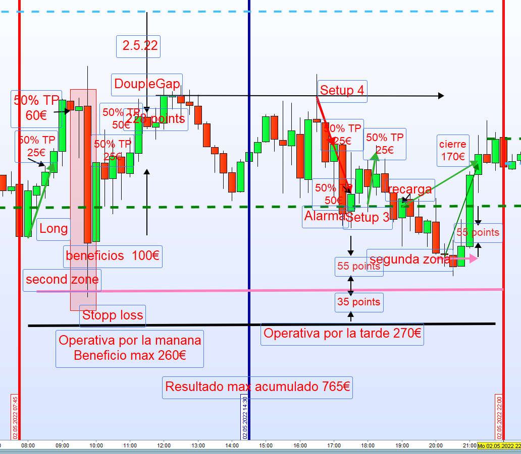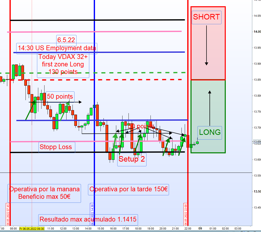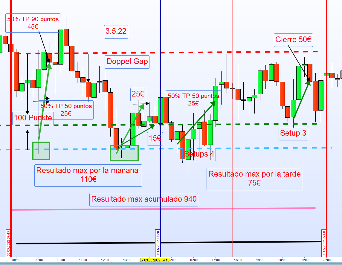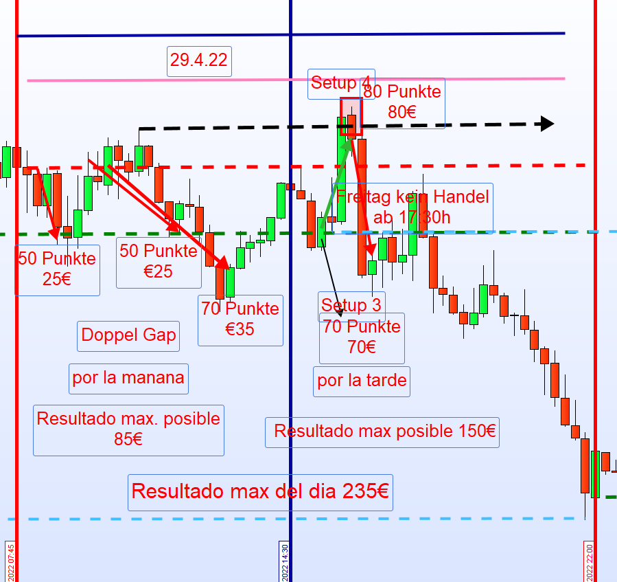 Adjunto la operativa de los dos ultimos dias . El resultado max que uno puede haber obtenido desde el 29.4.22 serian 1.414€. Han sido dias que todo funcionaba segun las reglas de la FDAX-TRADING-STRATEGIE.
