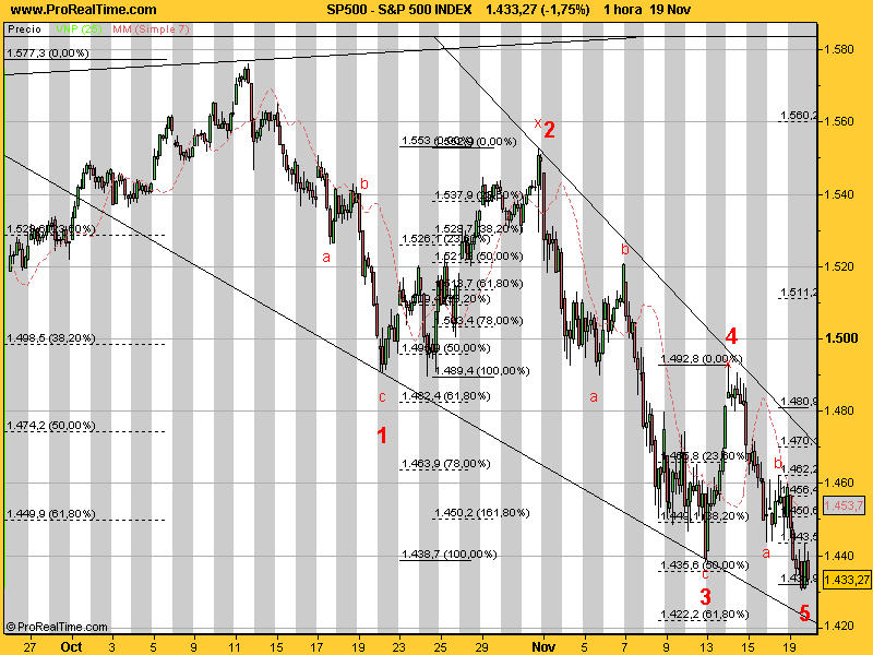 Hola Nuer.Estoy hecho un lío con los usa: creo que están haciendo un triángulo (la onda D ahora). la pista la da la violencia con la que rebota, característico de los triángulos: los puntos tangentes a las directrices del triángulo han de estar "limpios". Y sí, hacía tiempo que no operaba en el ibex y me paice que no lo voy a hacer más. Ahora me he centrao en el euro que ha empezado una bajada que puede dar juego (más me vale) y de los índices pues paso mientras no tenga claro qué pasa. Evidentemente si superan el máximo de hoy confirmarían la onda D y tiraría para arriba. Si rompen el mínimo de ayer confirmarían que estamos todavía en un impulso bajista y entonces se podría entrar corto o bien, quizás intentar cazar el suelo. No sé, pero estoy meditando pasarme a las divisas que me parecen más interesantes, pero seguramente tb siga con los índices usa en saxo o agenbolsa que es lo mismo porque tienen órdenes que no se cancelan y que rulan todo el día. Así las pérdidas siempre están bajo control. Y a la bolsa uropea que le den que no hace sino cosas mu raras. He visto latigazos en el dax por ejemplo de 80 ó no sé cuántos puntos en 1 minuto pa volver donde estaba otra vez. Recuerdo un stop que no me saltó en el ibex y me lo encontré 100pico puntos más abajo porque pasó sin dar tiempo. Lo disho si la clave es el control del riesgo esos mercaos están montaos pa que el control no lo tengas tú. Y amás las ondas funcionan mejor en el SP, ta claro. Aunque ahora está turbio.
