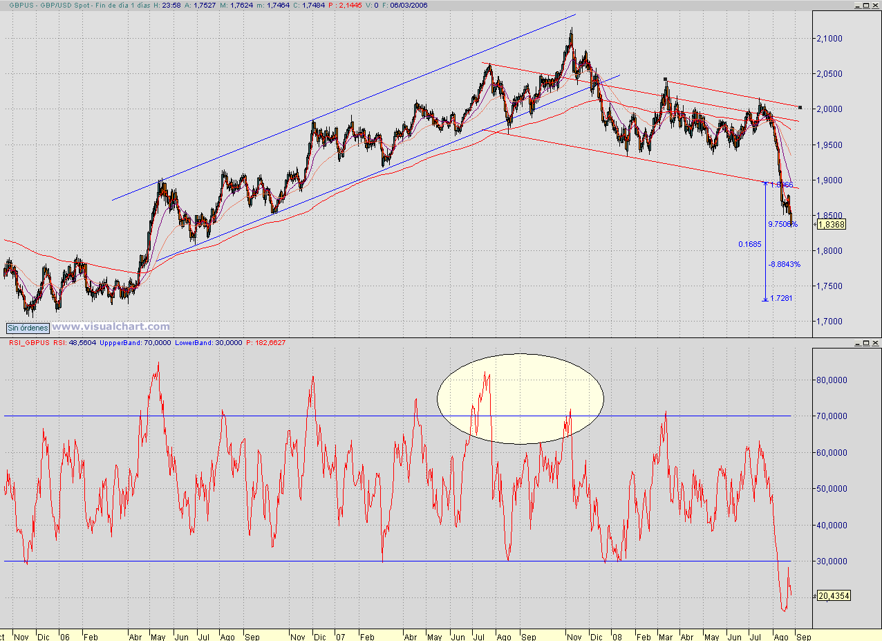 Y yo me pregunto ¿hasta onde llegará la caida? De momento a 1,4473 99% que sí pero después, no sé. Vamos a elucubrar: después de 5 ondas bajistas, que es un impulso, debe venir otro, el rsi del diario ha hexo divergencia bajista mayor mayor, y como pasemos de 43 vamos a tener otra en el semanal que es más determinante. Aemás, el rebote, si es que rebota, puede formar el hombro derecho de un gran hch donde el hombro izqdo estaría al final del año pasao, principios de este, y bueno, como se confirme la hipótesis de que rebote en 1,444-7 apoyándose en la citada línea de tendencia y se forme el hombro derecho, es que nos vemos en 1,28 porque este supuesto hch se rompería la baja ya que me extrañaría muxo que mi objvo en 1,4408 no se cumpliera.