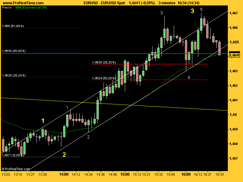 Sobre la pregunta del millón yo lo que veo es que hay un impulso desde el mínimo y eso significa que va a retroceder bastante. Me da que esta salida es la buena. La línea 2-4 que ha de romper está clara...al loro y parriba. Siguiendo con el rollete de la aceleración este retroceso parece más rápido que ninguno en toda la bajada con lo que tengo que pensar que es de mayor grado que los anteriores. Ha rebotao 100 pips en un momento. Yo me subo en el burro a la mínima que retroceda.