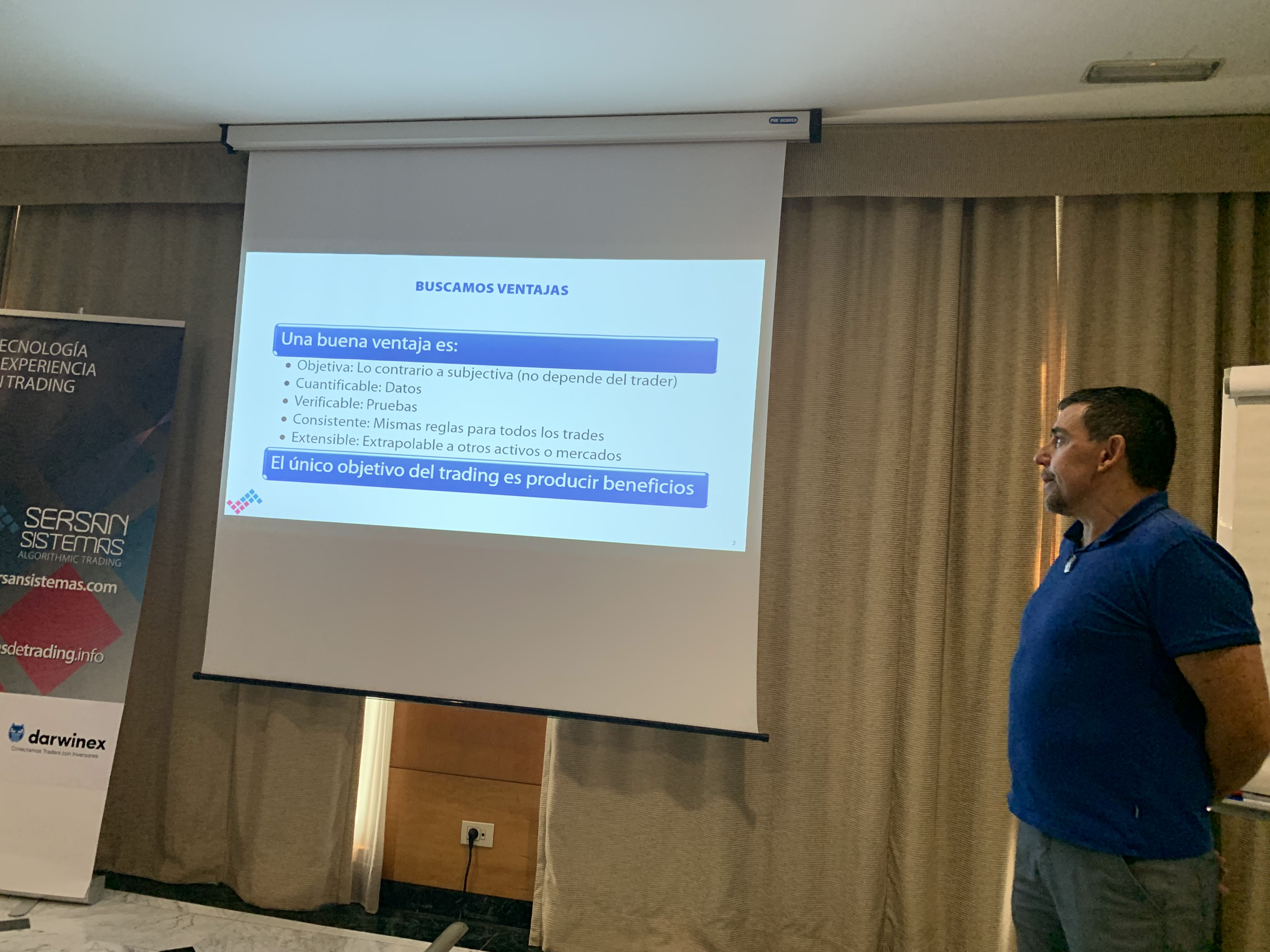 Seguidamente le tocó el turno a Sergi Sánchez, que nos impartió una master class sobre optimización y métodos walk-forward de sistemas de trading, comparando diferentes métodos y abriendo un amplio debate. Sin lugar a duda en esta charla se notó mucho el gran nivel de Sergi y porque su Darwin SYO es, a día de hoy, el 4º por capitalización del ecosistema, con más de 7 millones de euros bajo gestión: