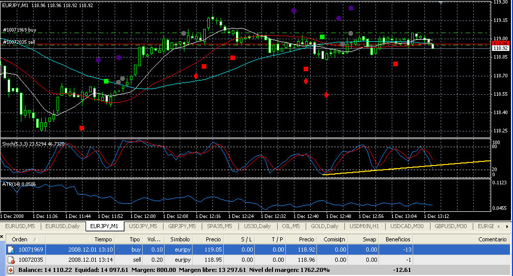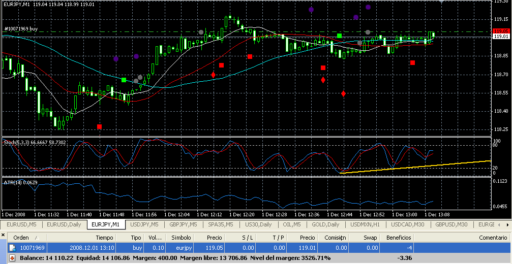 Me verás entrar muchas veces con acierto sin saber porque, eso es motivado por la experiencia adquirida como pseudo-scalper que he sido durante 5 meses que me ha acostumbrado a leer básicamente velas. Aún así siempre os dejo puestas las líneas de tendencia, fibos, medias y/o algún indicador que suelo utilizar. (ATR y stocastico)