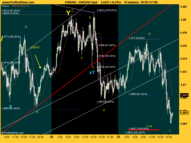 Por otro lado yo puse el objvo a vote pronto en 4650 y desde ahí ha rebotao 30 pips con lo cual no estaba mal del todo pero ahora viendo las cosas despacio resulta que estamos en onda 9, u sea ha habido una extensión de la onda 3, el RSI de 15" está entrando en sobreventa y además tengo por ahí un objvo en 4640 luego seguramente parará pronto