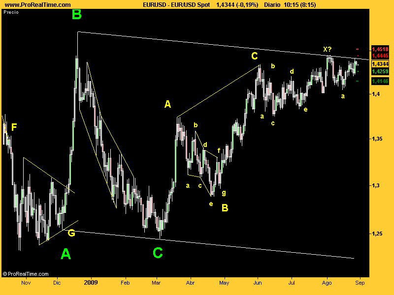 En estos momentos tengo una duda. Por lo que parece estamos formando una cuña alcista con un objetivo que no debería ir mucho más allá del 1.45.