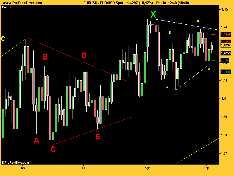 Y en el más corto plazo vemos que desde el 21 de agosto nos estamos moviendo entre el 1.4350-1.44 y el 1.42. Así que en el momento que rompamos por arriba o por abajo deberíamos tener un movimiento rápido de 150 pips aproximadamente en el sentido de la ruptura.