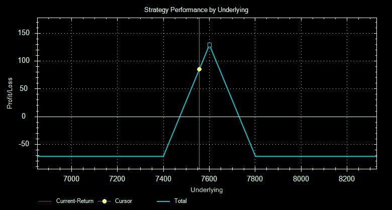 Supongo una volatilidad inicial del 35% para todas las opciones. 28 días a vencimiento. Subyacente en 7600. Construyo mariposa: