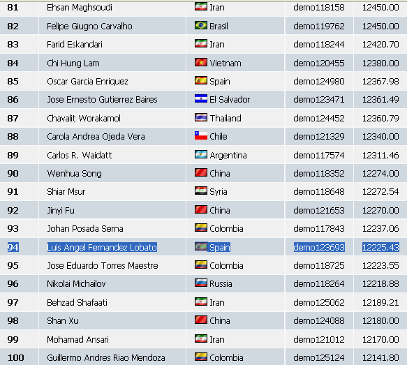 El primer español clasificado es Francisco Jose Romero Matas que se encuentra en el puesto 57 con una equity de 13.410,00$