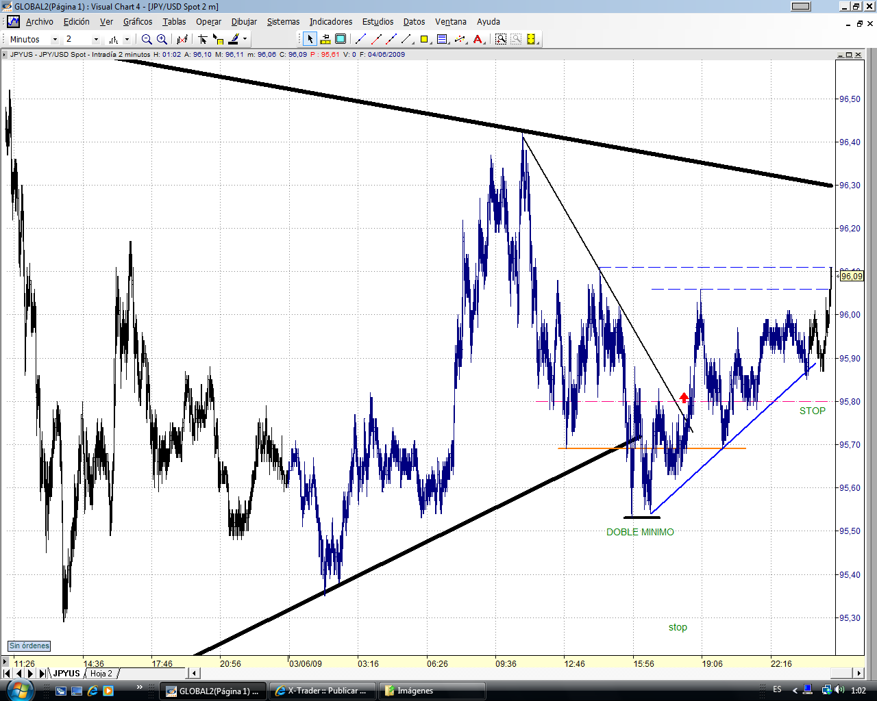 La superación del 96.10 debería llevar al precio a la parte alta del triángulo. Y yo creo que debería romper. En fin, el precio manda. Veremos lo que hace. Subimos stop a precio de entrada, 95.80.
