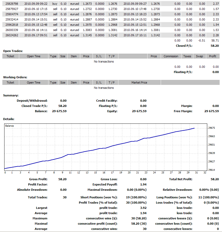 El que piense que acertar 30 de 30 con objetivos entre 1 y 6 pipos es algo complicado segúramente no lo habrá intentado nunca. Con este tipo de sistemas se pueden llegar a dar rachas de aciertos por encima del centenar de operaciones. Las rachas de 30 ó 40 son de lo más normal. El problema es que si se observa el gráfico de equity/balance que puse ayer, de estas 30 ha habido una que generó un DD relativamente importante si lo comparamos con los beneficios que aportan el resto de operaciones. Ese es el problema a resolver.