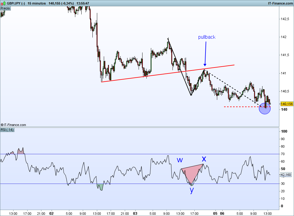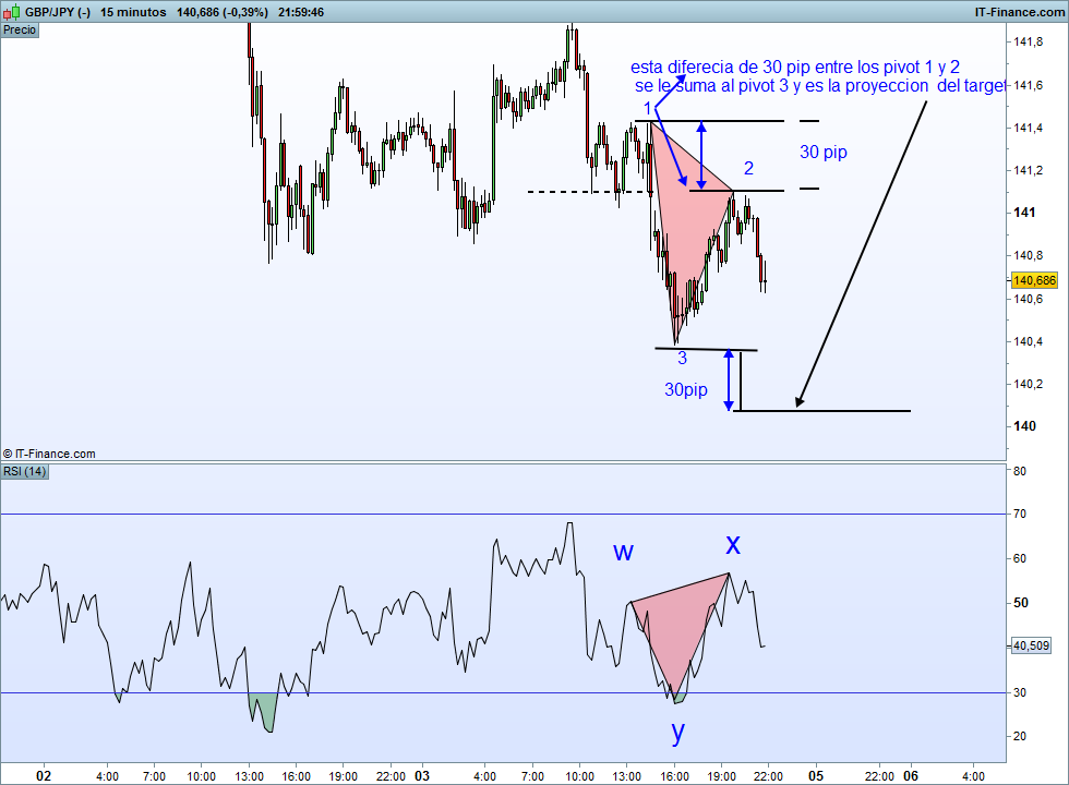 Es un patrón que en RSI se puede decir que es el mas importante, mas que las divergencias, mas fiable porque combina la estructura del precio con la del RSI en esas zonas de sobreventa- sobrecompra, es un patrón de giro y muy importante en los retrocesos