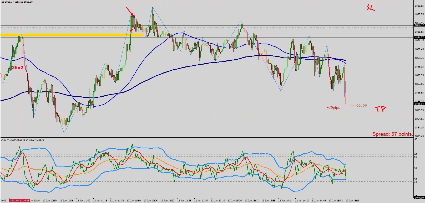 Deberia haber entrado en la flecha roja, pero estaba en el dentista y al llegar enseguida abrí y vi esto, aun estando en negativa la entrada desde la entrada, y con esa especie de zona de acumulacion, decidí entrar porque las pautas que uno crea son para seguirlas, asi que.. entré sin pensarlo, poniendo los niveles de SL y TP que corresponden respecto al nivel de entrada y....