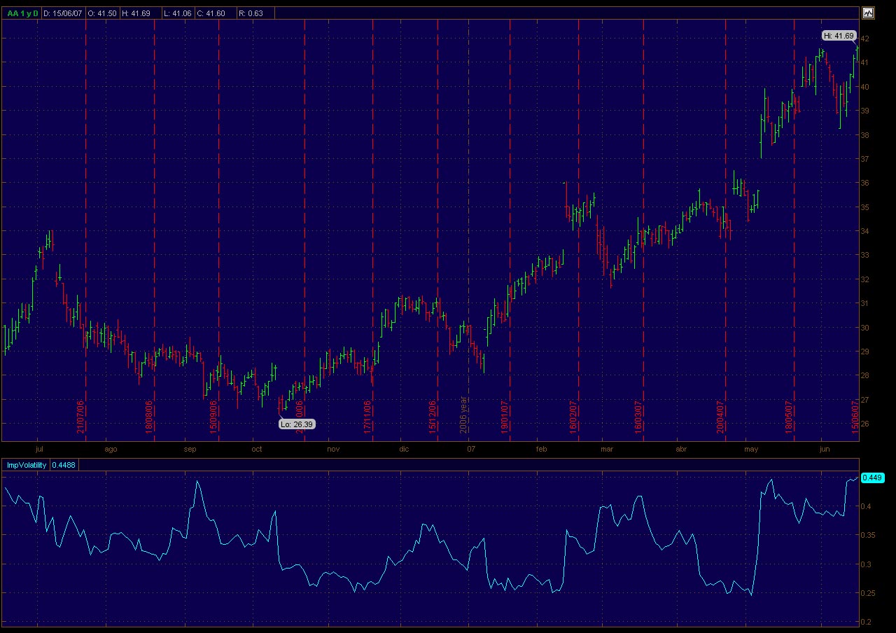 Cuelgo gràfico de Alcoa que ahora cotiza a la volatilidad más alta de los últimos cuatro años. Podría ser una buena candidata pero con esos huecazos que se gasta no se si la relación riesgo beneficio sería la más adecuada.