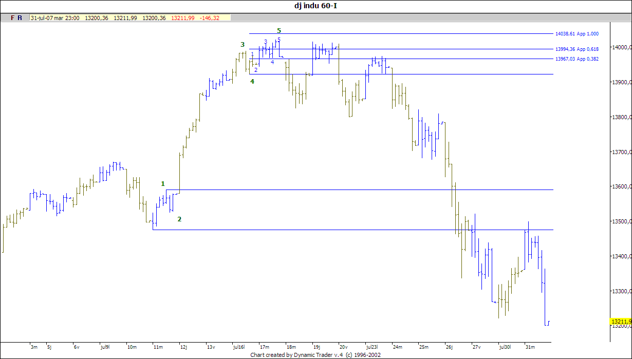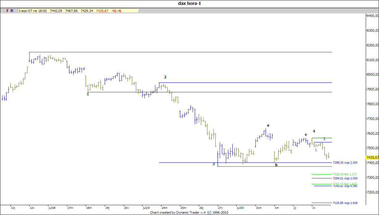 3- En este caso la parada anterior sería el final de la onda 3 y ahora estaríamos en la 5. O sea bajaremos un poco y rebotará seguramente el lunes o el martes. El gráfico que mejor refleja esta hipótesis es el del Dax, que ya el jueves me tenía mosca porque no se veía una onda 5 claramente, no descendió por debajo de su mínimo como el Cac 40. La 3 es el doble de la 1, luego la 5 probablemente se parezca a la 1 o visto el panorama llegue hasta el 160. Miner opina que el 127 y el 168 de retroceso de 4 son muy frecuentes para la 5 por lo que probablemente se detenga en 7240 maomeno.
