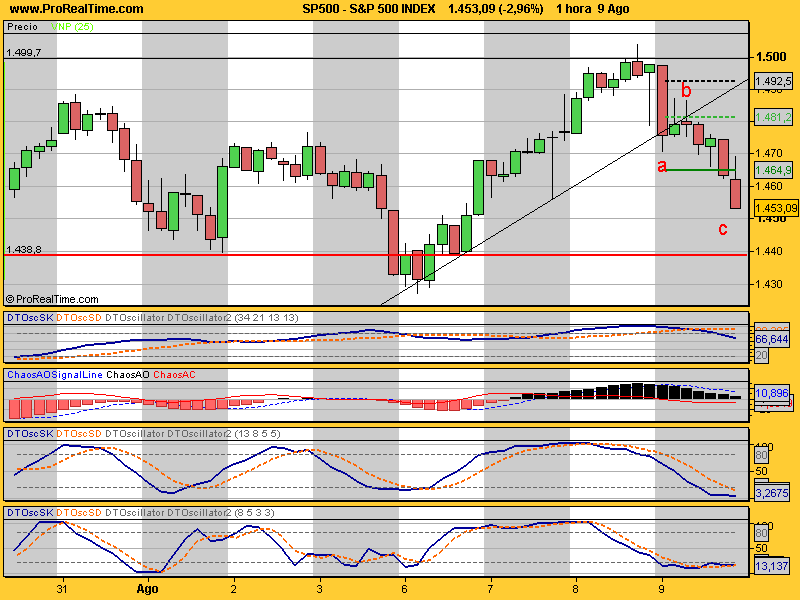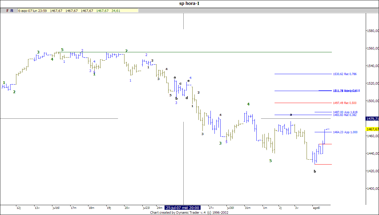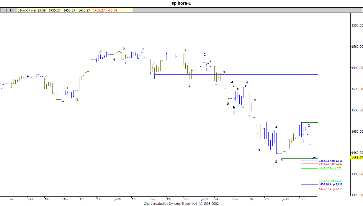A mí me parece que este final de onda puede estar en el dia 19 de Julio, habéndose producido un "fallo de quinta". Después de ello, la correción debe llegar al inicio de la pauta (1.484,18) en menos tiempo del que tardó en formarse, como parece que ha ocurrido.