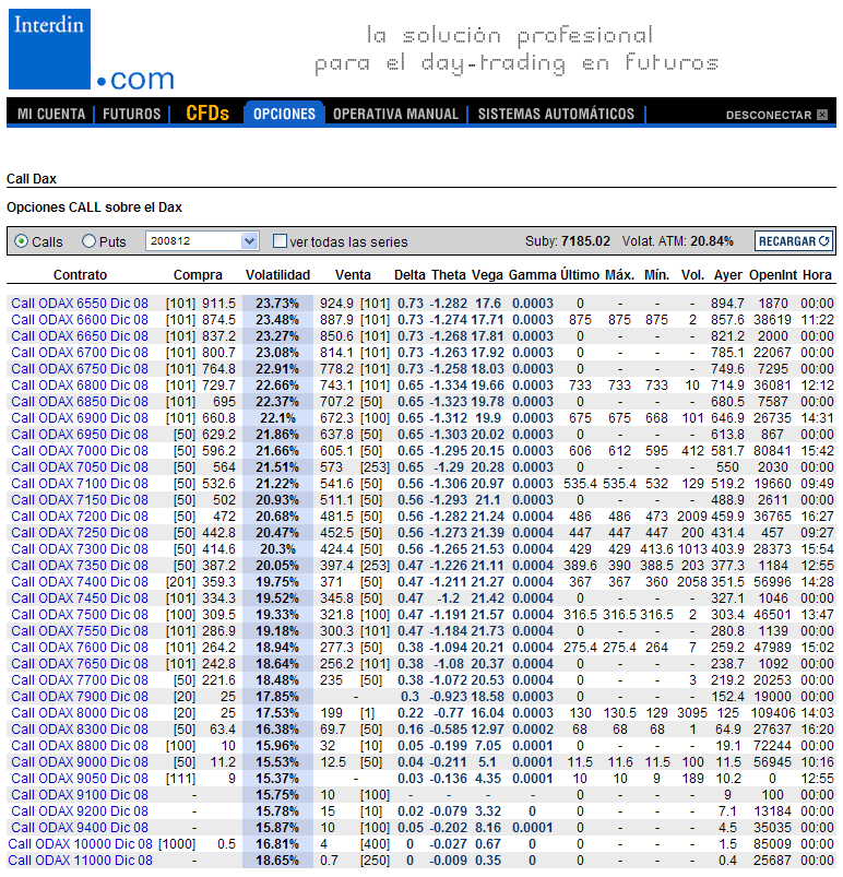 Como todavía tengo cuenta abierta en Interdin te cuelgo un pantallazo para que veas que es lo que te ofrecen. Como te aparecen las horquillas, puedes comprovar las bondad de los datos con una simple calculadora. Verás que hay diferencias (recuerda que las opciones sobre el Dax son sobre el indice contado, no sobre el futuro, y que hay que descontar dividendos), entre lo que ahí aparece y los cálculos que tu hagas.