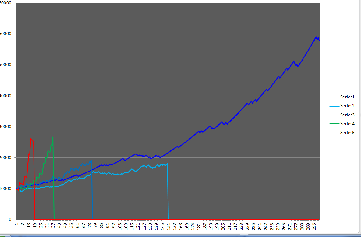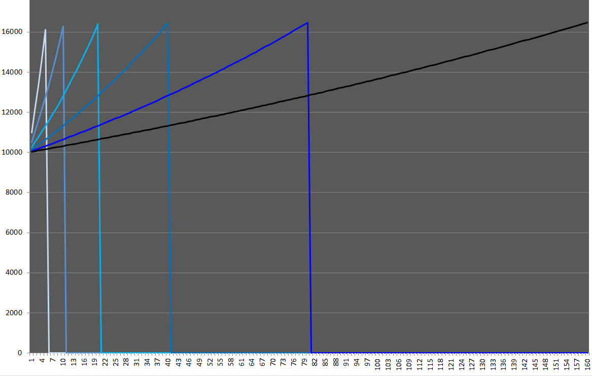 te queda asi doblando los traders para la misma rentabilidad el efecto del interés compuesto.....5,10,20,40,80,160.....