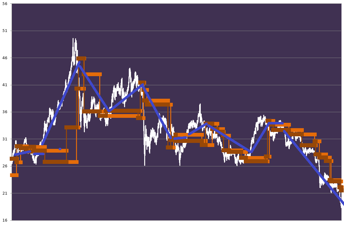 Mira pongo un ejemplo propio de lo que para mi empezaría a tener base científica, en este caso es un estudio pormenorizado, de extenuación tendencial, donde las líneas marrones nos marcan seguimiento de tendencia o extenuación con unas reglas, y que tiene que tener validez para el universo que se quiere gestionar, de activos o sistemas, como ejemplo pongo las líneas azules de rotura y tendencialidad que crean los algoritmos extenuantes.