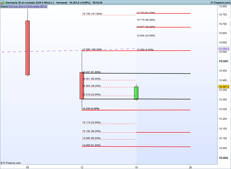 Buscando los cortos la 1º resistencia semanal esta en la apertura de la semana pasada que coincide con el cierre de la semana anterior y es el 62% del rango de la semana pasada esta en 10435, el stop debería estar en 10480 con objetivo en 10070