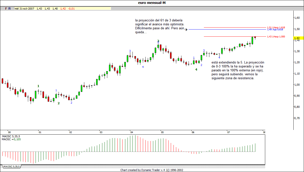 Me he puesto a zarzetar con el largo plazo del euro y está siguiendo todas las pautas ordenadamente. Se adivina un gran techo en el mensual, pero claro aún queda. La última subida en principio podría parecer una onda b por su poca aceleración, pero creo que viendo cómo van las cosas es la 5 y última. Está creando la divergencia típica de 5. Zoomeando en el semanal, vemos que aún queda. y estamos acabando la 3 de esa 5. Cuando acabe la 3, a la que le pueden quedar solo días, la bajada será considerable. Si supera el 1,43 habrá que estar al loro de un día que cierre por debajo del mínimo del día del máximo. Para arriba ahora aún hay recorrido, pero no mucho. Amás amás no tengo claro todavía si esto es un impulso o una onda b hasta que no supere el 1,43 claramente y pa entonces mejor esperar el patapumpabajo.
