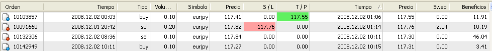 while (1==1) { print "No operaras el primer viernes del mes" } en la lista que pones, dice queentras vendido a las 18:55 eur/jpy a 117.72 pero a esa hora el precio no cruza ahi.. ¿donde me estoy perdiendo? ¿esta mal la hora?Spirit escribió:Bueno, llego la hora de plegar y dejo el hedge equilibrado +0,2, -0,2