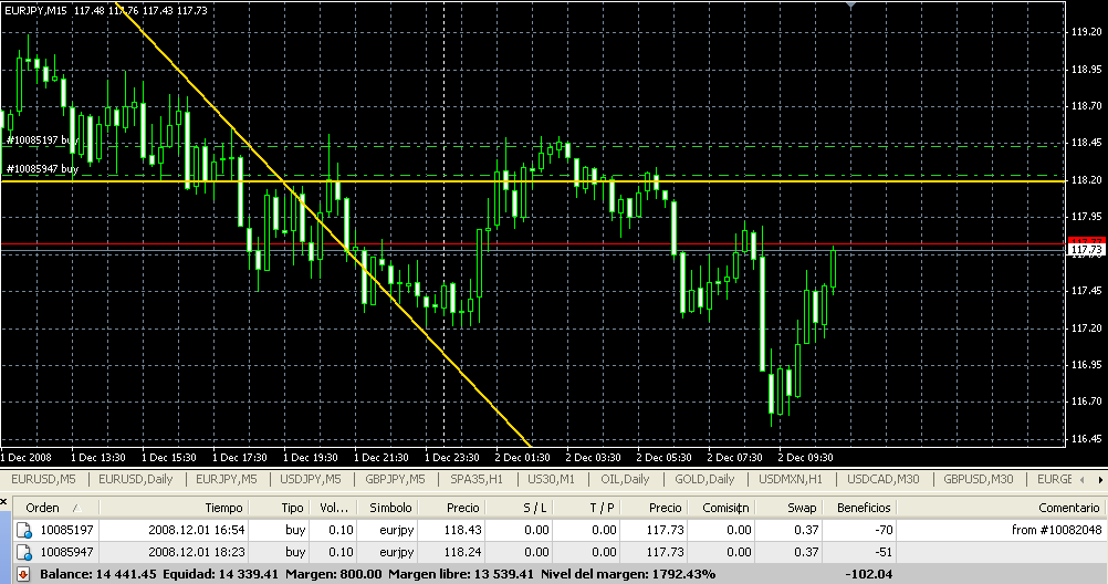 Miro el gráfico y veo que ha recuperado hasta 117,70 para darse la vuelta a 117,50. Debo decidir si abro o no una posición sell para cubrir las buy y sobre todo, si no lo hago ¿Donde debo abrir esa posición por "imperativo legal"?