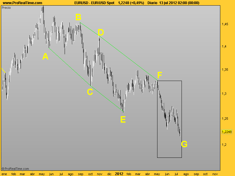 De momento sigo manejando este escenario como el más probable, esta en pleno pullback y debería iniciar el descenso; si superase el 1.25 estariamos en otro escenario.