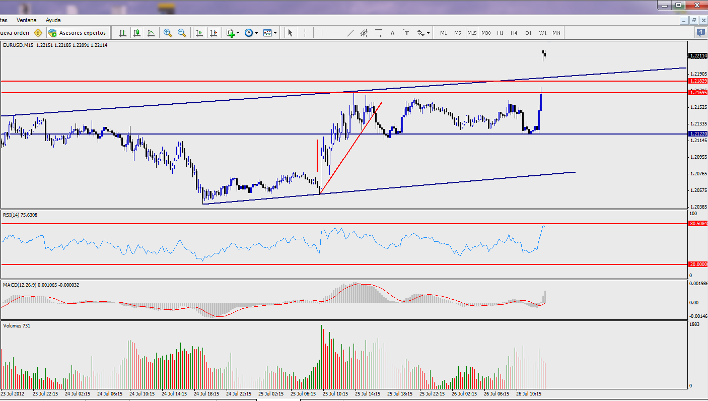 Hola spirit en 1.22684 he tomado el corto ¿porque? extremada sobre compra en rsi, base del triángulo de 120 que nos sirvió anteriormente para marcar objetivo de caída en 1.2060, resistencia fuerte cercana en 1.2286 y la mas fuerte de todas en 1.2324, son las decisiones que me han llevado a ponerme corto; sin duda no ha sido un gran DIA para mí, pero bueno ya sabemos que esto funciona así, aunque pienso, mira como son las cosas que si cuando estaba en rango hubiera optado por actuar en él, es decir, ponerme largo en 1.2122........ las cosas cambian.Spirit escribió:¿Punto de entrada que has tomado?marvelas escribió:Ya que con el largo no he podido me pongo corto, llega a objetivo, me pongo corto, objetivo 1.2190 stop 1.2330