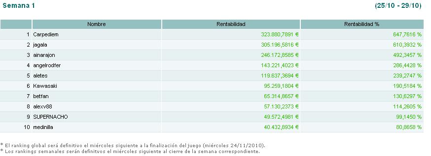 Estamos en la tercera semana de juego y así estan las cosas. Una plataforma que hace aguas por todos lados, que permite que alguien se plante con un 121.403,05%, y mientras tanto debe ser que a los señores de inversis le parece algo de lo mas normal, ya que lo permiten y no hacen absolutamente nada. Si a esto unimos la atención y respuestas que han dado a Jagala, que rayan lo surealista, mas parece que estamos tratando con un grupo de principiantes mas que con una entidad medianamente seria.