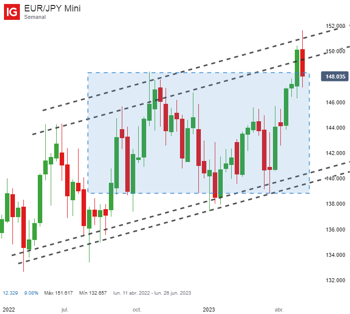 Ahora analicemos el Dax en relacion al Dow, este último ha consumido su ATR Semanal con creces pues ha bajado en la semana 1200 pip....esto significa para mi que puede haber un rebote al alza a partir de hoy viernes a zona 33600/33700...rebote que puede traer al Dax nuevamente a zona de máximos y superarla anulando la actual formacion de H-C-H....por eso solo sé que no sé nada...es lo mejor que me puede suceder no saber nada pues para mi el trading es un juego de probabilidades al 50% de acertar o errar. Ahora si que sé donde tengo que disparar, cuando se ponga a tiro por ejemplo en el EUR/JPY disparé esta semana arriba en 151 y cerré ayer en 148 cuando cumplio su ATR semanal...500 pips para el bolsillo y a esperar a ver que hace Actualmente estoy largo en brent esperando alcance objetivo en zona 7700