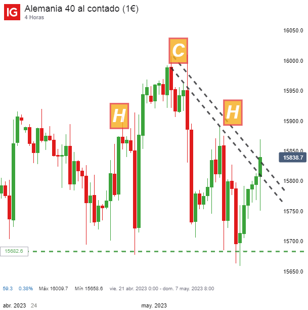 Montando mi estrategia y analizando los mercados me encuentro con El Dax en grafico 4h con un H_C_H irregular con zona clavicular en 15680 actual base del lateral(zona alta 16000), lo normal seria comprar en la base de este lateral pero ya lo he hecho un par de veces y tarde o temprano lo romperá con el acompañamiento del DOW que empieza a buscar hueco a la baja.....La tendencia del Dax Alcista frente a la del Dow Bajista.