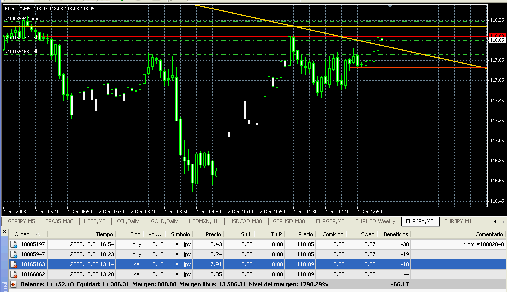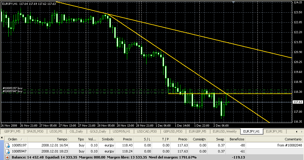 Por lo tanto cierro todas las posiciones sell y me quedo con o,2 lotes buy abiertos. Si me he equivocado y comienza a caer con fuerza voy a martingalear para recuperar lo perdido con este movimiento. Abriría 0,4 lotes sell en algún punto entre 117,40 y 117,25. La situación quedaría entonces +0,2 lotes buy -0,4 lotes sell. Todavía dentro de los límites del hedge que están mucho más lejos (+2,5 lotes buy, -2,5 lotes sell)
