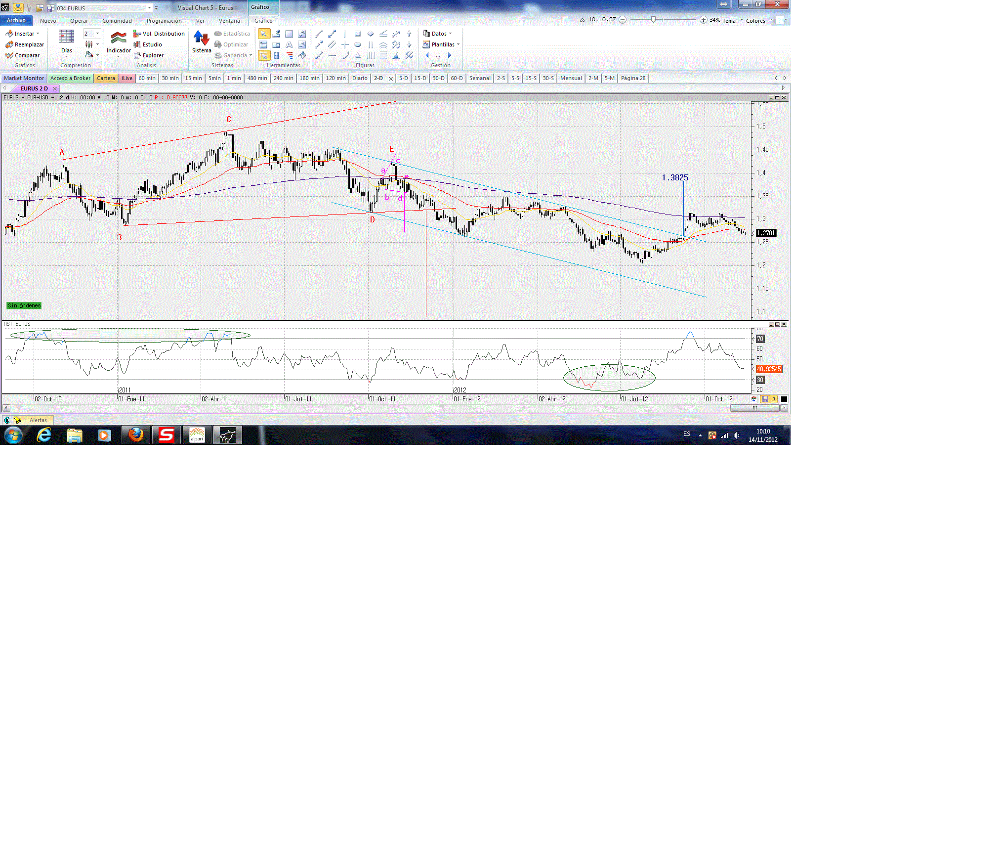 En cuanto a esa proyección coincido exactamente con los de Goldman (incluso ya lo anuncié aquí cuando se rompió el canal bajista que os muestro en celeste). Si rompiese el 1,328 la subidita mínima nos llevaría a 1,4019. Implicaría un semifallo de la estructura bajista, un tipo de fallo que no es muy probable pero ya lo he visto antes. Y digo semifallo porque no invalida el objetivo bajista de 1,075, pues para que se invalidara plenamente debería superarse el 1.4247ParetoPao escribió:sabes quien dice "estar largo" : ? o mejor dicho, decir q el euro va parriba ( a 1.40 en 12 meses) : ? Goldman Sachs....aunq de esos...a ver quien se fia de lo q dicen jejejejeje