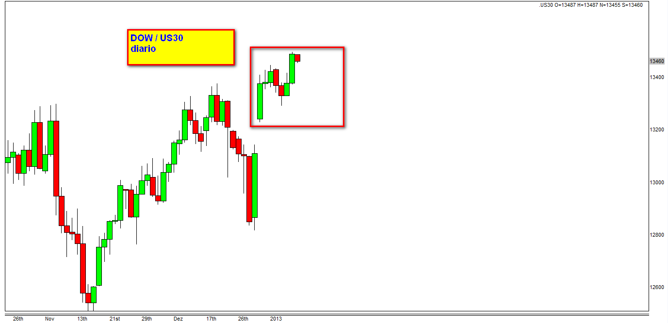 Desde el hueco alzista del dia 2 de Enero 2013 se puede observar una fuerza relativa del DOW en comparacion