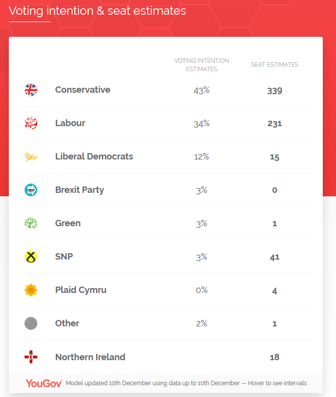 Y llegó el gran día!!! Hoy tienen lugar las elecciones en UK, recordad que las urnas cierran a las 23.00 h. CET por lo que la sesión asiática para los pares de GBP va a ser bastante volátil. En principio se espera que gane Boris Johnson con cierta holgura, este es el resultado del último sondeo de YouGov: