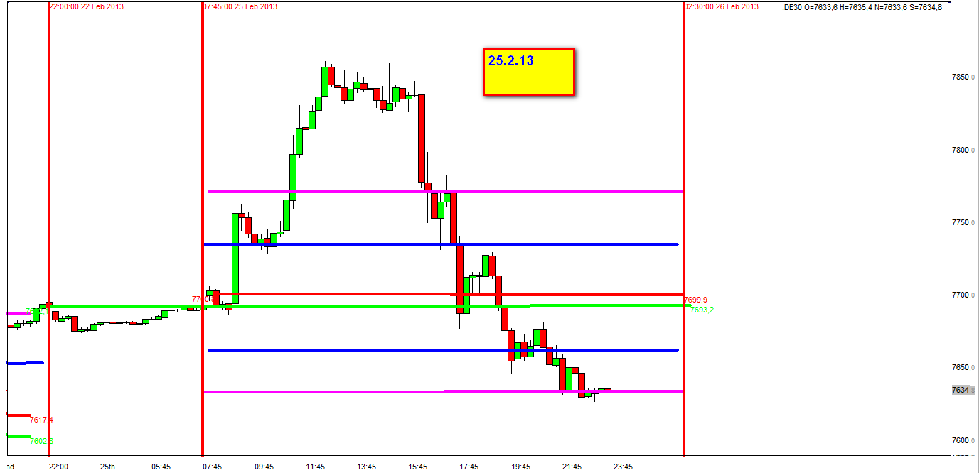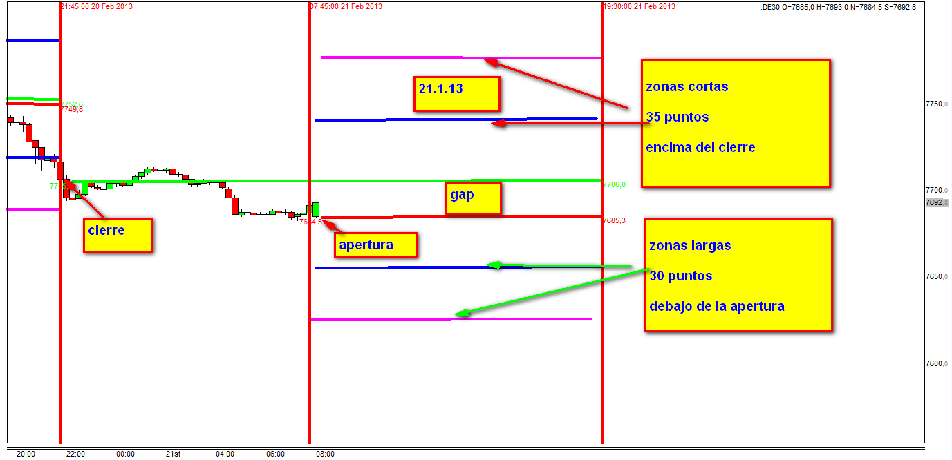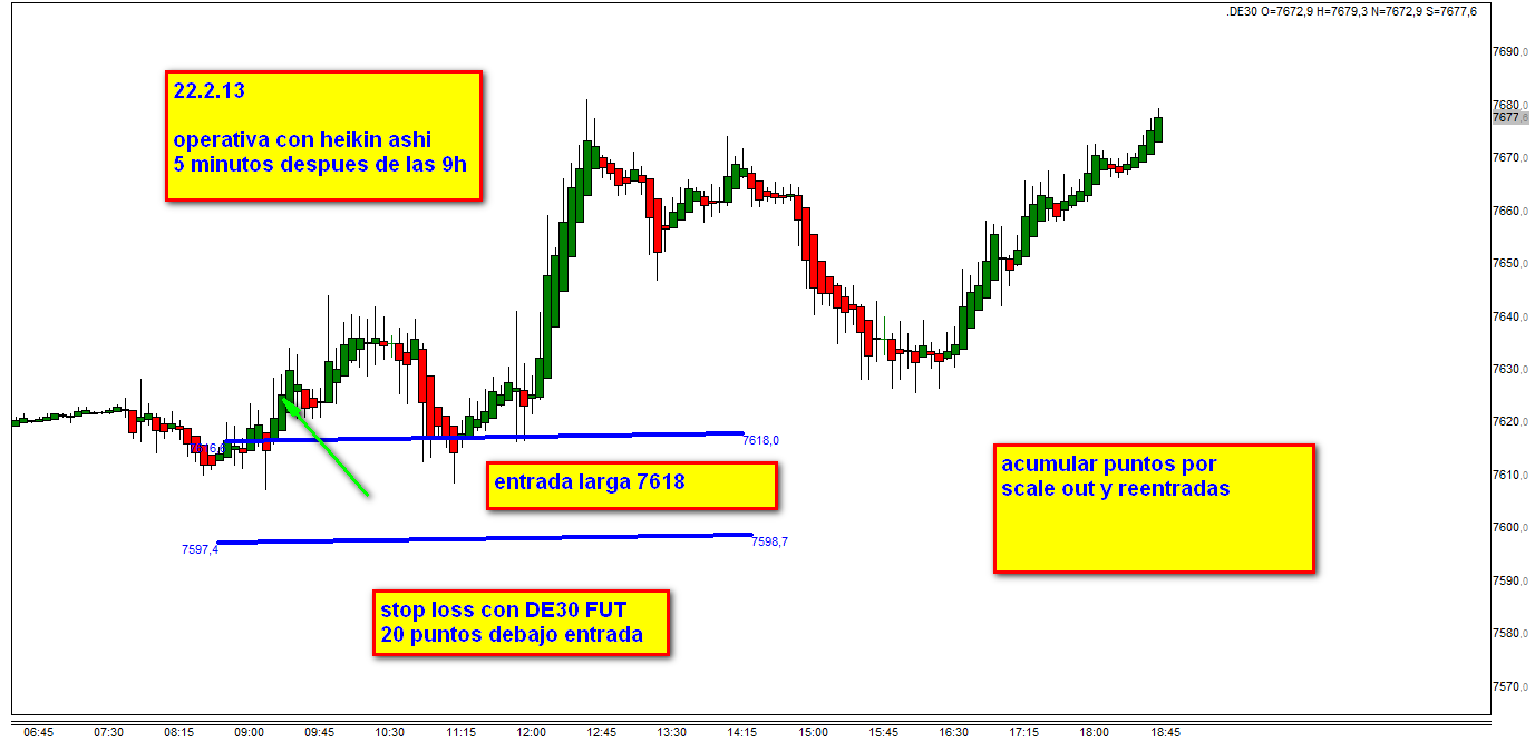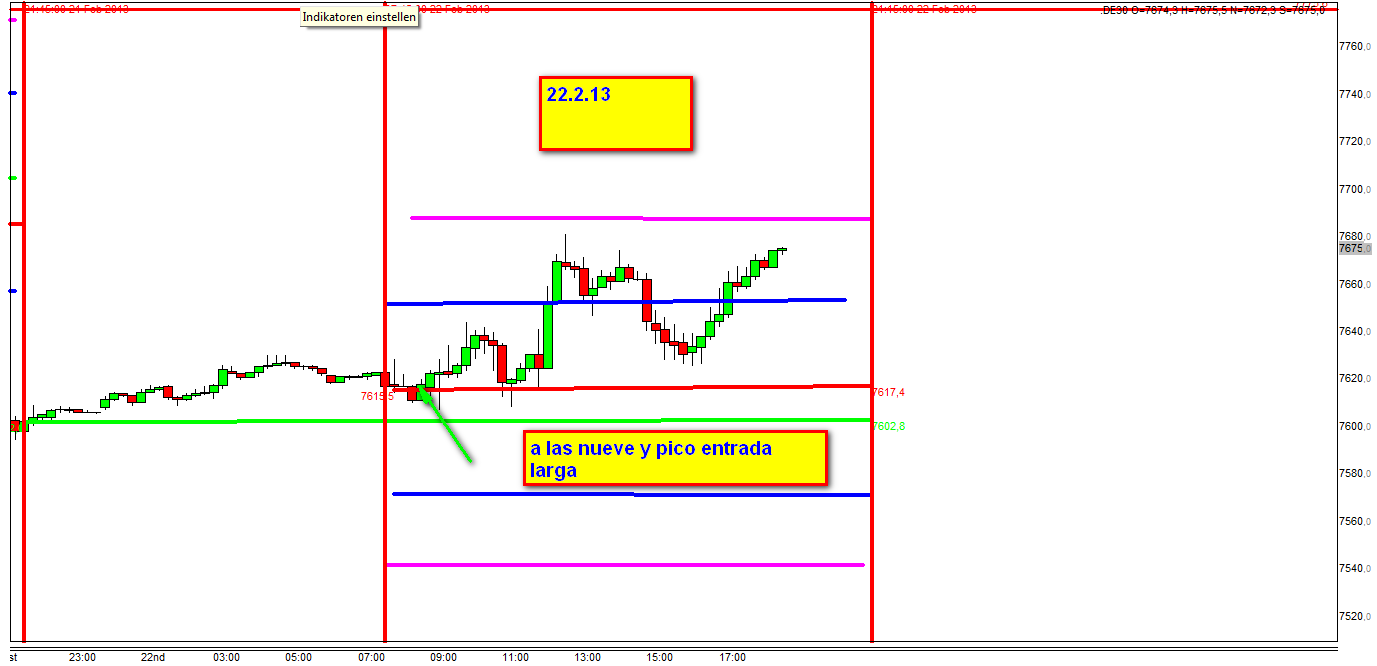 Hoy con largos DE30 cash al precio de 7618 con stop loss con DE30 FUT 20 puntos debajo es decir 7598. Este precio nunca ha sido alcanzado.