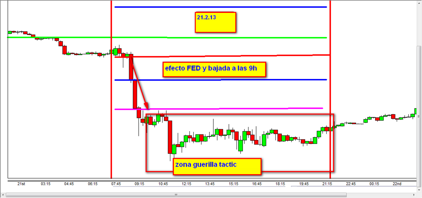 Ayer entramos cortos despues la apertura del XETRA-DAX a las 9h. Debajo (o encima) de la 2. zona practicamos el micro trading con la guerilla tactica que explicare manana.