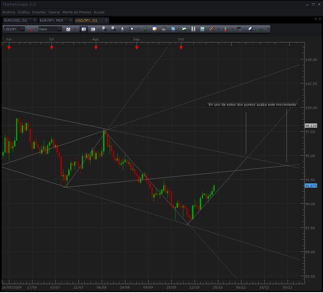 Pues despues de mirarlo bien, y aunque mi predicion de hace quince dias se va cumpliendo como un reloj, hoy no se, creo que no va a llegar a los puntos que puse, por lo menos en la fecha que estan marcados, me da que se va a adelantar la llegada a los limites de 95, no lo se, es una intuicion nada mas, pero me da que en cualquier momento el yen tiene que tomar alguna determinacion.
