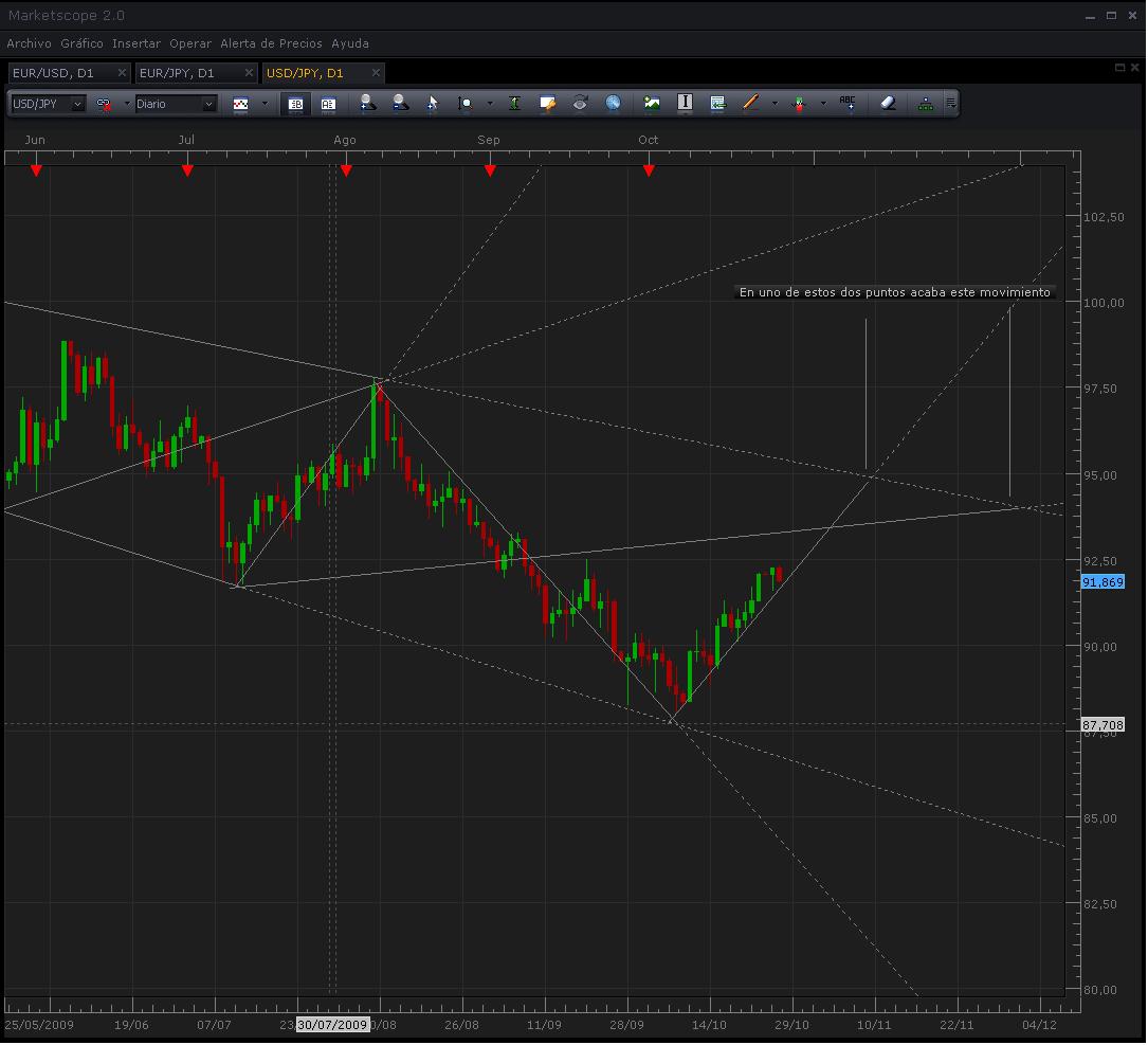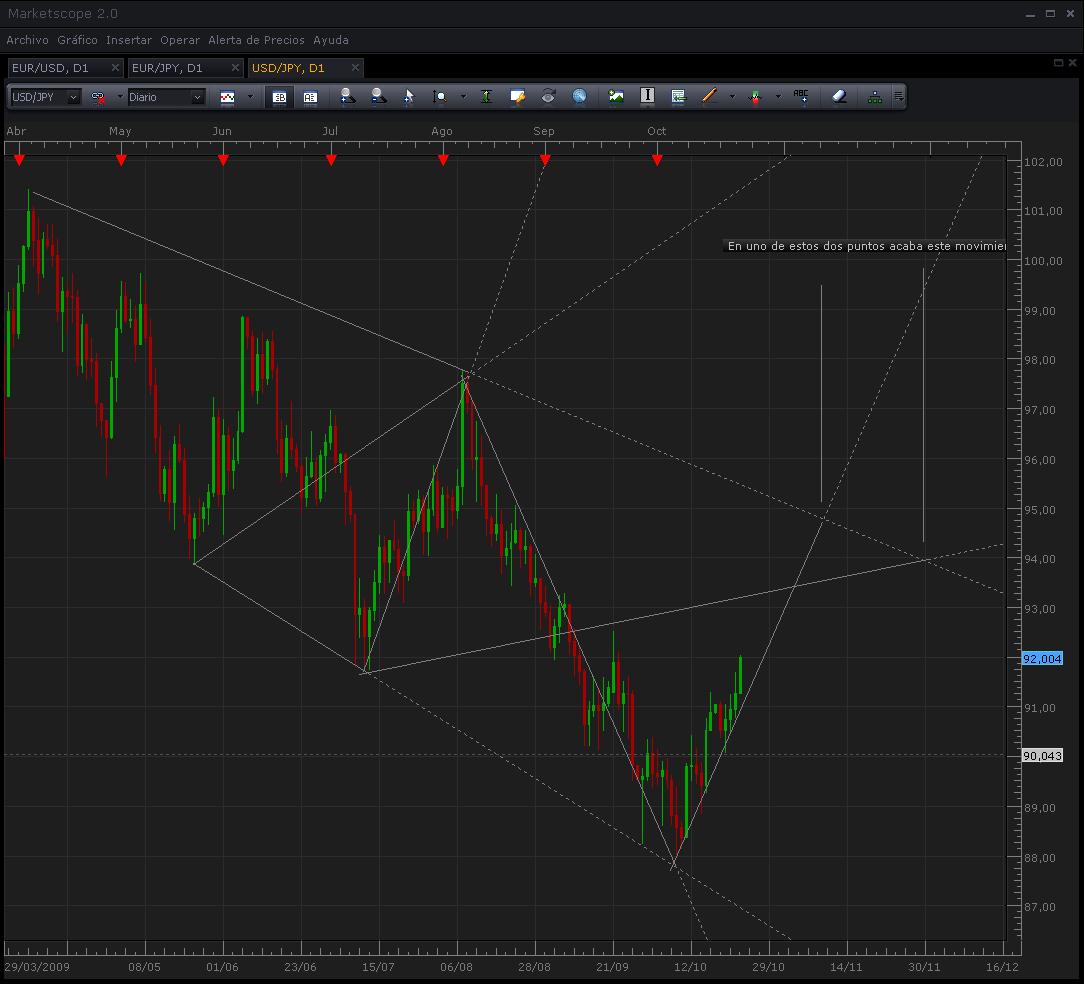 En dos semanas el precio se mantiene donde esta ahora (es decir... entre 91,5 y 92), bah!! este escenario si que es improbable, porque solo por historia vemos que el yen siempre baila por muy poquito que baile el dolar, esto es debido a que el yen esta muy sujeto a las inversiones en dolares y hay mucho movimiento por las noches (cuando todo el mundo duerme) y el yen siempre (no le queda otro remedio), baila al son de la musica que le pone el dolar, por lo que es muy poco probable que el yen se quede quieto en estos limites...